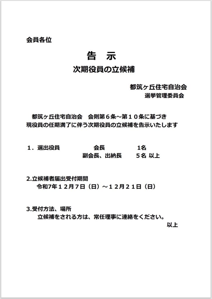 次年度自治会役員の立候補受付中です! 2025年12月18日 最終更新日時 : 2025年12月18日 tsuzukigaoka 12月21日(日)まで受け付けています。 自治会活動に関心のある方、やってもいいかな、という方はぜひ立候補お願いします。